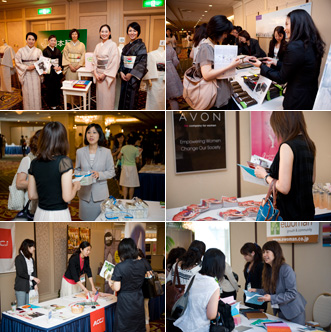 一方、創業期から女性の自立や活躍の場を提供したエイボンは、国際女性ビジネス会議の主旨に賛同しご協賛いただき、ブースでは商品や女性支援の紹介をされました。そして毎年サポートいただく在日米国商工会議所はブースでは、日本国内でのアメリカ企業を中心とする商工会議所のパンフレットを配布されました。